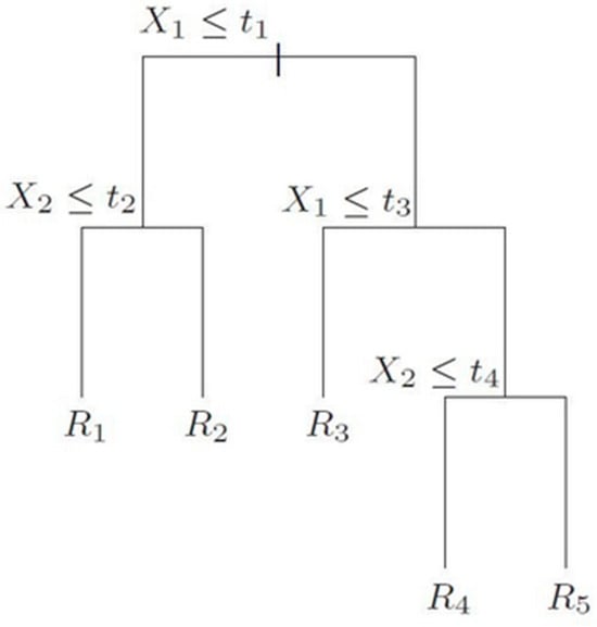 Diagram of CART construction. X1 and X2 are data features, while t1 through t4 are cutoff values [18].