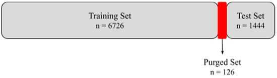 Our full dataset consists of 31 years of daily returns for the S&P 500 Index, a very popular capitalization-weighted index of stocks traded in the United States; our full time series begins in February 1993 and ends in March 2024. While the S&P 500 has historical data starting in the 1950s, we restrict the sample to a more recent period due to the possibility that older data are less relevant to modern markets. Beginning in the early 1990s allows us to capture the entirety of the current era of globalized markets, though any chosen starting point will be somewhat arbitrary. We partition our 7846 data points into three non-overlapping pieces—a training set, a purged set, and a test set—as depicted in Figure 2 below. While the training set and test set are standard in machine learning, the purged set is somewhat unusual and follows the recommendation of Lopez de Prado [22]. In time-series data like ours, serial correlation can lead to informational leakage when the test data directly follow the training data. By “purging”, or discarding, data between the two sets, we can reduce this risk and protect the validity of our conclusions. We purge 126 data points, or six months of daily data, for reasons we will soon explain.