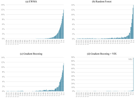 Tree-based methods of machine learning allow for a degree of insight into how the model makes its predictions. For random forests and gradient boosting, we can answer this question through variable importance analysis. Each time a tree is split, the variable importance algorithm tracks the splitting predictor, as well as how much the sum of squared errors (SSE) is reduced. By averaging across all created trees, variable importance produces a relative ranking of all the predictors. Figure 4 illustrates the variable importance measures for our three tree-based models and compares them to EWMA weights.