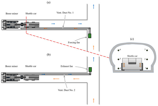 Layout of mining equipment in cases of forcing (a) and exhaust (b) ventilation systems; grid of measurement points 1–6 in the cross-section of a mine working (c).