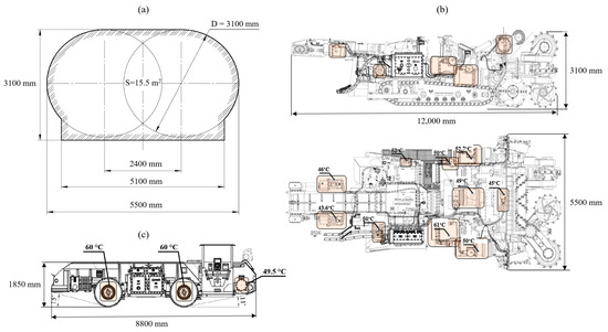 Air temperature measurements were also conducted in the section shown in Figure 1c at six points near the shuttle car (2 m behind the BM operator’s cabin). Additionally, air temperature was measured at the mouth of the dead-end working and at the outlet of the ventilation duct. Temperature measurements were performed using a portable Fluke 971 thermo-hygrometer (Fluke Corporation, Washington, DC, USA). Long-term air temperature measurements were carried out using a Kestrel D3 sensor (Nielsen-Kellerman, Boothwyn, PA, USA), while surface temperatures were recorded with a Fluke infrared thermometer and a Hikmicro G60 thermal imager (Hikmikro, Hangzhou, China).
