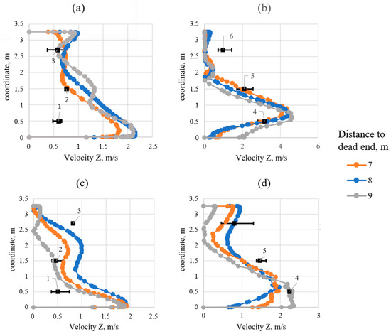 First, the mathematical model was validated using data from a full-scale experiment. The measured values of temperature and air velocity in the section shown in Figure 1c were used for validation. Figure 4 compares the vertical profiles of air velocity along the axis of the dead-end working, based on numerical simulation results and experimental data (measurement points 1–6). The average measured values and their variability, determined from a sample of measurements, are shown for the experimental points. This variability is associated with the unsteady mass transfer processes in the dead-end working, caused by technological factors such as the sloshing of a flexible duct, movement, and falling of ore from the BM’s boom, among others.