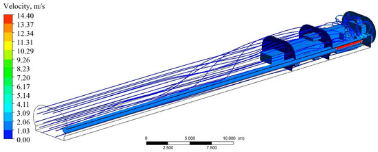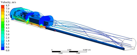 In the presence of a shuttle car, the air stream leaving duct No. 1 is more constrained and expands more slowly. As a result, Figure 4b shows higher peak velocities at the bottom of the dead-end working (approximately 4.5 m/s), whereas Figure 4d shows significantly lower peak velocities. Figure 5 illustrates the streamlines of the airflow interacting with the shuttle car and ventilating the dead-end working containing a BM and shuttle car.