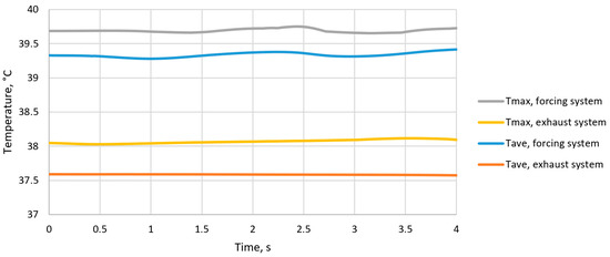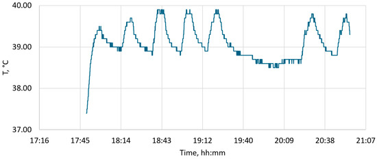 When validating the model for temperatures, we compared the measured and calculated temperatures near the BM operator’s cabin. During the experimental studies, we were able to capture the temporal trend of the temperature in the area of the operator’s cabin (see Figure 6). The peak values (39.9 °C) correspond to the period when the BM was on and the shuttle car was near it. The minimum values (38.6–38.8 °C) correspond to the period when the BM was off and the shuttle car was absent from the dead-end working. These values were used to adjust the model.