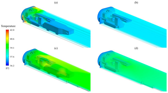 Volumetric temperature fields for the operating BM with a shuttle car (a,c) and the shut-off BM without a shuttle car (b,d), in an exhaust ventilation system (a,b) and a forcing ventilation system (c,d).