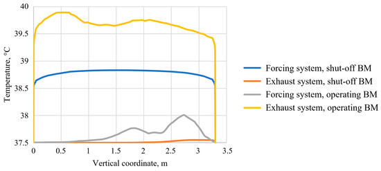Additionally, the exhaust system is advantageous in terms of maintaining comfortable microclimatic conditions near the BM cabin. The average air velocity in this area is less than 0.5 m/s, as shown in Figure 7. Of course, working conditions, even at a temperature of 37.5 °C, cannot be described as comfortable. However, it is important to highlight that the exhaust system does not cause additional heating of the air before it reaches the workplace. Introducing a colder air stream into the dead-end working could potentially lower the temperature to the required levels, but this aspect is beyond the scope of the current study.