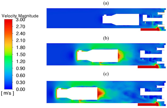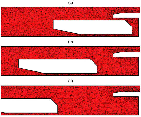 Figure 10 shows the median vertical section of the finite-volume mesh at different time points. Figure 10a represents the initial state, Figure 10b corresponds to 2 s, and Figure 10c to 4 s. The figure illustrates how the mesh is reconstructed during the calculation process while preserving the approximate characteristic cell size in the area vacated by the shuttle car.