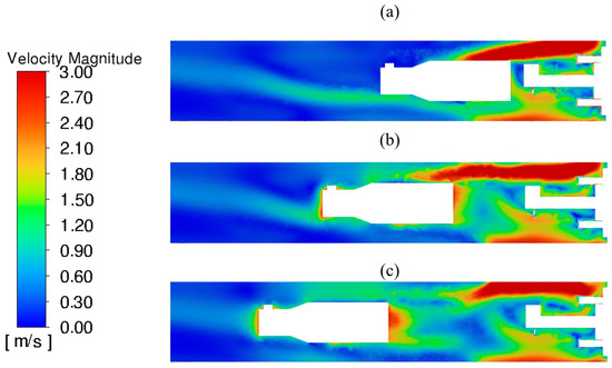 Air velocity fields in the middle horizontal section of a dead-end working at different time moments: 0 s (a), 2 s (b), 4 s (c); forcing ventilation system.