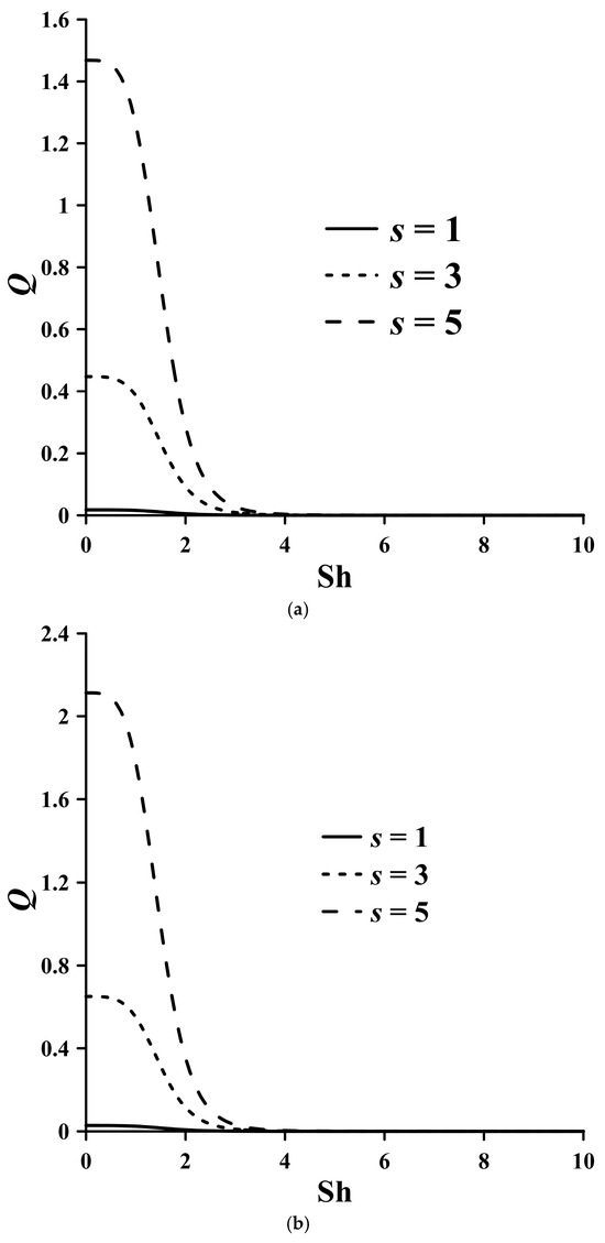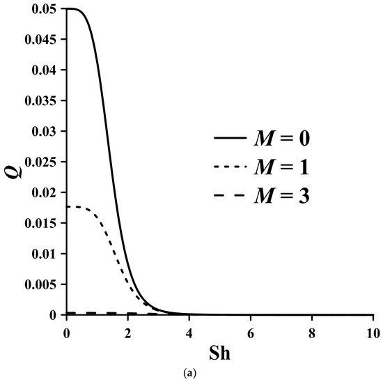An increase in parameter M leads to a decrease in heat generation at smaller values of Sh number (Figure 9), which can be explained by the decrease in relaxation time.