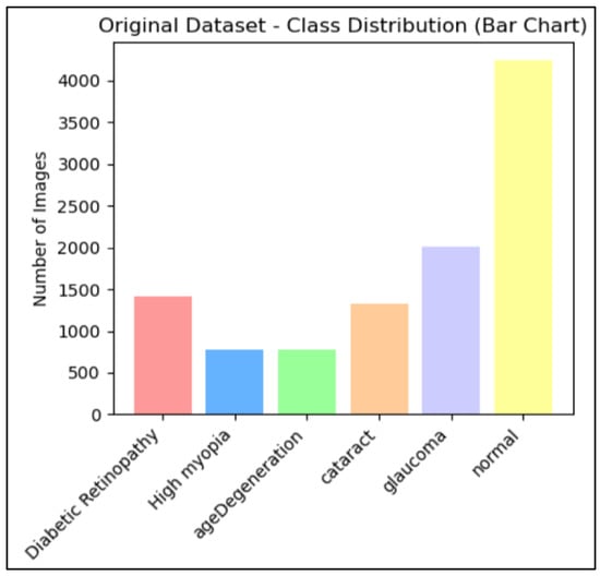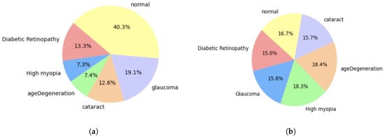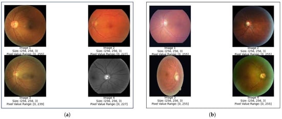 Figure 2. Eye Retina dataset before and after data augmentation. (a) Class distribution of original dataset. (b) Class distribution of processed dataset. - Data Normalization and Rescaling: Pixel values typically fall between 0 and 255 when working with image data. However, in deep learning models, large integer inputs may impede the learning process. Normalizing the pixel values is advised to reduce this. Normalization is a technique that scales an image’s pixel values to a predetermined range, typically between 0 and 1 or −1 and 1, to ensure uniformity in pixel values []. This helps in efficient processing and learning of data by machine learning models. Normalization is crucial for maintaining consistency among photos, as image data often have different intensity ranges. It also enhances model performance by affecting the input scale, allowing for improved results and faster convergence []. Additionally, normalization reduces bias by preventing wider pixel intensity ranges from controlling the learning process. In this study, all pixel values are scaled to a range between 0 and 1 during the normalization process. This can be performed by dividing each pixel value by 255, which is the maximum pixel value in the range. For efficient training, this procedure makes that the input data are within a tolerable range.The code uses the PIL library for image manipulation and the sklearn.preprocessing. MinMaxScaler class for scaling. The code iterates through the dataset, importing each image and converting it into a numpy array. For single-pixel images, pixel values are set to [0, 0, 0] to avoid division by zero. For nonsingle-pixel images, they are normalized by dividing them by 255.0 to scale them between 0 (very dark) and 1 (brightness). The normalized pixel values are then scaled using MinMaxScaler to fit within the range [0, 1]. Figure 3 visualize the Eye Retina dataset before and after data normalization and rescaling.