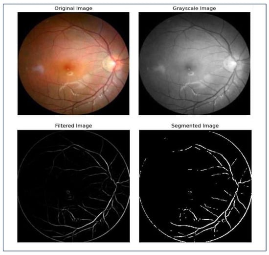 - Image Segmentation: Image vessel segmentation is crucial in ocular retina analysis for detecting and diagnosing retinal diseases. It provides valuable information about the vascular system, potentially indicating multiple retinal pathologies. Our code employs techniques like grayscale, filtering, and threshold for vessel segmentation. Figure 4 illustrates the different steps of image vessel segmentation.