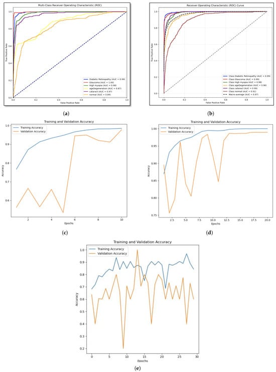 Random forest model’s performance is assessed using ROC curves by (Figure 5b), and we find that the model with all classes has high AUC values, indicating remarkable prediction accuracy. The macro-average AUC score illustrates the model’s overall efficacy in class distinguishing. This approach illustrates how the model might assist in the identification of certain eye conditions. The test accuracy of 81.86% and validation accuracy of 80.93% are marginally higher for the RF model. This proves that the Random Forest model performs consistently when applied to unknown data. Moreover, The VGG-16 model’s learning curve (Figure 5c) shows that the training accuracy is steadily increasing and is getting close to 100%, indicating that the model is successfully picking up the patterns present in the training dataset. Although validation accuracy fluctuates at first, near the end of the training process, it stabilizes and approaches training accuracy. This finding implies that the model has a high degree of generalization power across unknown data. Nonetheless, according to the MobileNetV1 model’s learning curve (Figure 5d), the validation accuracy plateaus and eventually approaches the training accuracy after a few epochs, indicating that the model performs well when applied to new data.