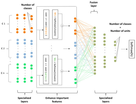 This part is paramount in the modifications performed on the MNN [8,9] architecture. It consists of the following steps. First, the number of units in the output layer of each component must be equal to the number of classes. Second, we calculate the cost of each component to identify those with the best features from the others. Third, we calculate the weight of each component by putting the component’s cost value’s opposite in the vector to apply SoftMax of each value of the vector, The result is a vector representing the weights of all components, which is calculated using the following equation: