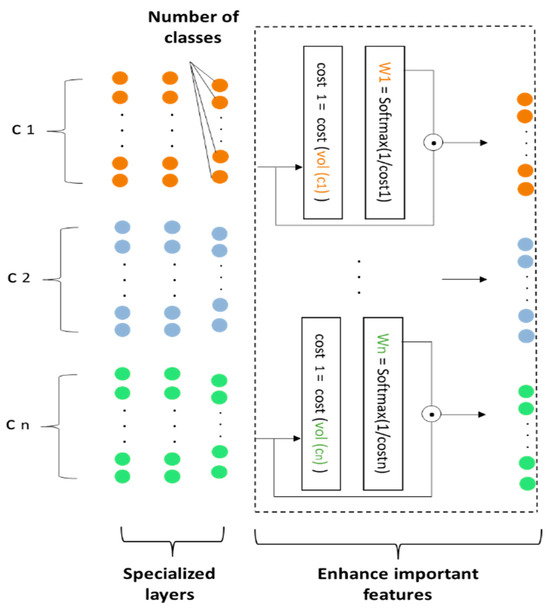 Before we gathered all the components in the fusion component, we calculated the cost of each one by determining the appropriate loss function. This determined the component that carries the most important features of the element , which eventually means extracting the best features and ignoring the unimportant ones. Therefore, to accomplish this task, we need to calculate the weight from its cost and multiply it by the output vector of that component, as shown in Figure 3.