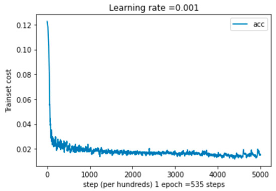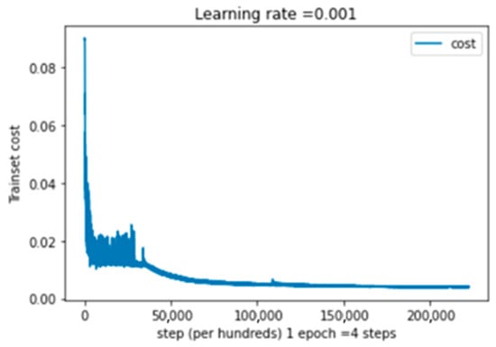 Table 1, Figure 5, and Figure 6 show, respectively, the classification report, the training cost, and the training accuracy for our multimodal system. We can observe that the cost curve’s greatest value is obtained at about 0 epochs and that it decreases as the number of epochs rises. The value is achieved at a cost of 0.0016. In terms of training accuracy, we observe that the maximum value is attained, followed by a drop to the maximum value, which stabilizes after a predetermined number of epochs. The value then rises to 99.22%. In the multimodal confusion matrix, the maximum value of the true label is 25,448 for class 1. This represents the high value in this matrix.