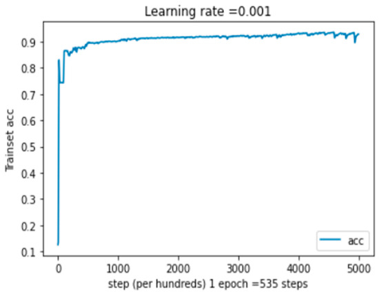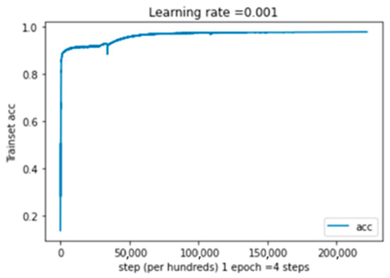 Regarding the training accuracy shown in Figure 8, we can see that for the latter, the maximum value is attained, followed by a fall and then a return to the maximum value. After a given number of epochs, this maximum value stabilizes at 97,81%. On the other hand, the unimodal system’s matrix of confusion (Table 5) shows that the maximum true etiquette value for class one is 3983. This stands for the highest value in this matrix.