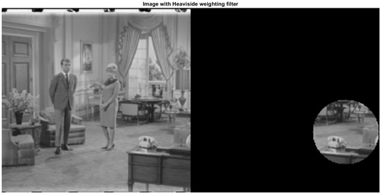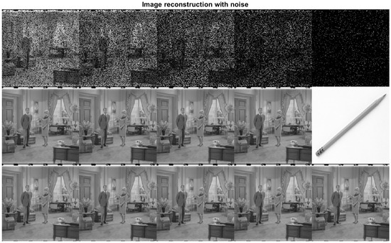 In example 2, we consider a given corrupted image with different Gaussian noise levels, as shown in the first row of Figure 4, where it has randomly uniform degradation contamination set to zero oscillating with , , , , and of corrupted information from left to right, respectively. These percentages mark the probability that a pixel is corrupted or not. Applying Algorithm 2 calculates the metric between corrupted information and the information in the database, where the result is the nearest image to the actual data. The results using Algorithm 2 are shown in the second row of Figure 4. A Heaviside filter is applied for the corrupted image, as shown in Figure 5, together with Algorithm 3 to work with the essential information of each image, generating the third-row results in Figure 4.