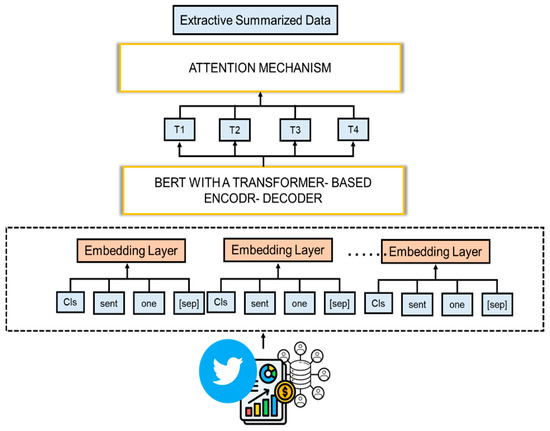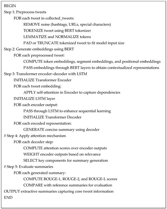 Automatic text summarization (ATS) is a complex challenge, particularly when applied to short, noisy, and contextually diverse texts such as tweets. Current approaches often struggle to strike a balance between compression and retention, leading to either overly generalized or incomplete summaries. The proposed framework, shown in Figure 1, integrates the strengths of bidirectional encoder representations from transformers (BERT) and transformer encoder–decoder architectures (TEDA) with an advanced attention mechanism and LSTM units. This design addresses the unique challenges of Twitter-based summarization, such as limited character counts, informal writing styles, and the need for high computational efficiency.