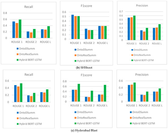 Table 4 and Figure 5 present a comparative analysis of the proposed BERT-LSTM framework performance against two established summarization techniques, namely OntoDSumm and OntoRealSumm, across three distinct disaster datasets: Hagupit, SHShoot, and Hyderabad Blast. Each model’s performance was assessed using several metrics: F1 score, recall, and precision, evaluated through ROUGE 1, ROUGE 2, and ROUGE L measures to reveal significant insights into the effectiveness of the proposed framework. The hybrid BERT-LSTM framework demonstrates superior performance, achieving higher recall, precision, and F1 scores across all datasets compared to conventional extractive summarization methods. These scores underscore BERT-LSTM’s ability to capture contextual dependencies effectively, enhancing both precision and recall compared to other summarization techniques.