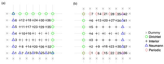 To illustrate the FD-discretized system, we first review the 2D finite difference (FD) discretization of Poisson’s equation. Figure 2 presents two examples of 2D rectangular domains with uniformly spaced mesh grids, differing in BCs: NNDD in Figure 2a and DPNP in Figure 2b, where the BCs are named in the sequence of West, South, East, and North boundaries. The boundary nodes are distinguished by colors and symbols—green circles for Dirichlet (D) nodes, blue triangles for Neumann (N) nodes, and red diamonds for Periodic (P) nodes. At corners where two boundary conditions apply, both must be considered for the corresponding node. Inside the domain, black crosses mark the ‘Interior’ nodes, which require solutions. Additionally, solutions must be determined for Neumann and Periodic boundary nodes, except for Dirichlet nodes. The linear indices of the solution nodes, based on Equation (4), are labeled on the right side of the grid in Figure 2. Outside the Neumann and Periodic boundaries, a layer of ‘Dummy’ nodes is added. These auxiliary nodes do not belong to the physical domain but serve as computational padding.
