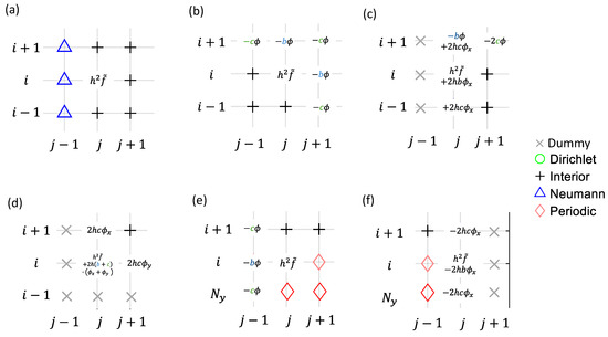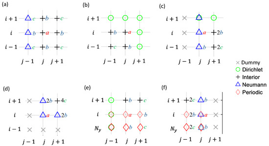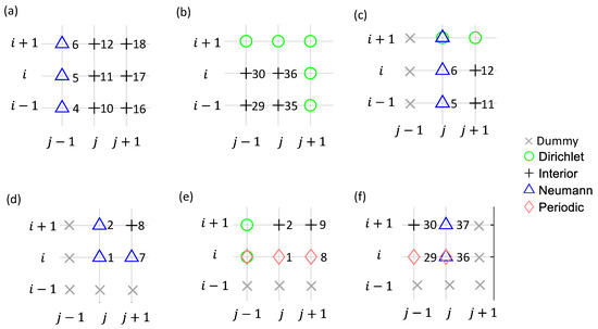 When the boundary conditions (BCs) become non-homogeneous, the finite difference (FD) discretization of Poisson’s equation near the boundaries becomes more complex. To illustrate this, we analyze two example grids (Figure 2). For a generalized approach to discretization and source terms, we select nodes #11, #36, #6, and #1 from the domain in Figure 2a, along with nodes #1 and #36 from Figure 2b. A closer view of these nodes, their neighbors, and local sub-indices is shown in Figure 3. The discretization results of left-hand side (LHS) and right-hand side (RHS) stencil weights, modified by the BCs, are shown in Figure 4 and Figure 5, respectively. Among these nodes, detailed discretization processes are given only for the more complex cases, i.e., the cases in Figure 3d–f. Generalization of discretization processes is made for simpler cases in Figure 3a–c. Since the discretization focuses on the LHS stencil weights, the coefficients , , and are now simplified to , , , and for the following discussions.