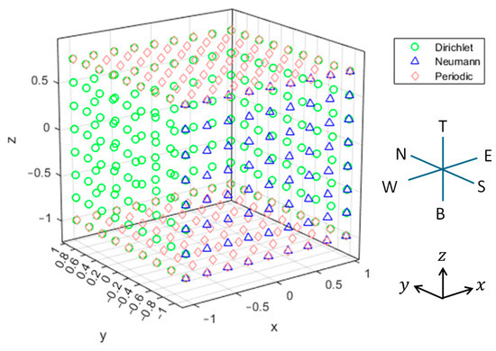 To evaluate the source terms () induced by various boundary conditions, the equivalent Dirichlet BCs proposed in Section 3.1—generalized directly from the 2D version—are used. This approach avoids the added complexity of implementing a 3D-specific computer routine.