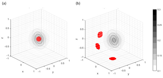 The resulting computational times are presented in Figure 18, with auxiliary reference lines indicating and for comparison. The mean, 99.9th percentile, and maximum errors are identical for both methods, confirming their numerical equivalence. For the matrix inversion technique, the computational time increases approximately with , which corresponds to the total number of entries in the full matrix . In contrast, the matrix decomposition method yields significantly lower computational times, scaling approximately as , which corresponds to the number of nodes along one side of the cubic domain. This confirms that the proposed decomposition method effectively reduces the 3D problem to 1D ones, as discussed in Section 4.2. Consequently, the matrix decomposition method achieves a speed-up factor on the order of .