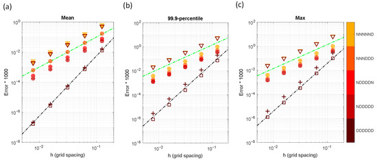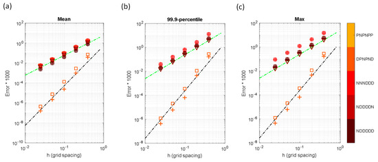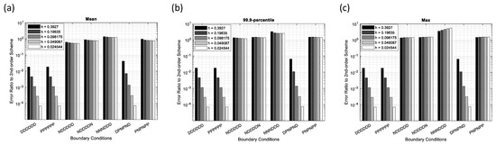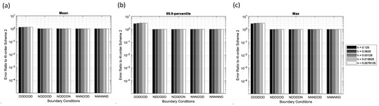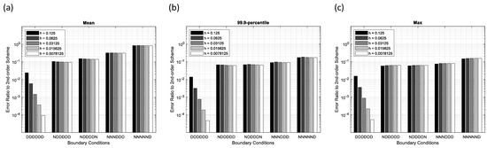 Error ratios of the 4th-order scheme-1 to the 4th-order scheme-2 for various boundary conditions and grid spacing in the sinusoidal source problem. (a) Mean error, (b) 99.9-percentile error, and (c) maximum error.