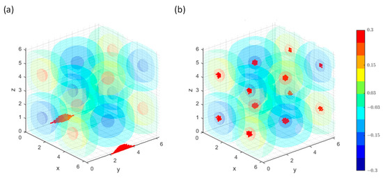 A few things can be observed when using the matrix decomposition method. Firstly, the 2D FD discretization of Poisson’s equation generates a large sparse solution matrix of order (i.e., Equation (12)). Direct matrix inversion of such a large matrix would require large computer memory as well as computational time. In the matrix decomposition method of Equation (17), the solution matrix is reduced to a tridiagonal one of order , which is equivalent to solving a 1D system along the y-direction. Although the matrix needs to be inverted for modes, the process is independent of each other and therefore faster. Secondly, the eigenvectors, , and the inversion of the tridiagonal matrix, , can be predetermined and stored for repeated use if the grid does not change its geometry. This is favorable in reducing the computational time by removing the calculation of the eigenvalue problem for each time step in the simulation of the temporal evolution of the problem. To preserve the accuracy intended by the FD discretization, the contributions of all modes are considered in the modal decomposition and reconstruction. The only exception is the rare case where the transformed source vector, i.e., in Equation (17b), is observed to be a zero vector, in which case its modal contribution can be neglected.