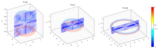 Examples in vortex-in-cell simulations of heads-on collision of coaxial vortex rings at . Three snapshots of vorticity iso-surfaces () as well as the instantaneous streamlines on the y=0 plane at non-dimensionalized time steps, i.e., T = 0 (Initialization), T = 5, and T = 10, are presented. The simulations are obtained from Dirichlet BCs of stream functions on all boundaries.