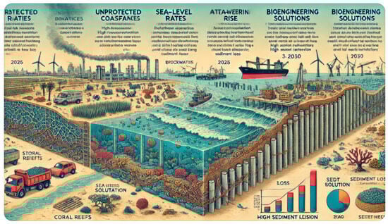 Under extreme climate scenarios, numerical models contrast bioengineering solutions (salt marshes, seagrass, and coral reefs) with artificial stability (breakwaters, artificial reefs). The findings showed that whereas artificial structures reduce sediment retention by about 35% by 2050, they are only somewhat beneficial in the short term. On the other hand, because of their capacity for self-healing and adaptation, bioengineering solutions showed greater long-term resilience, holding onto around 55% more sediment by 2050.