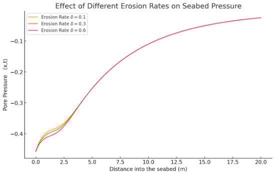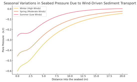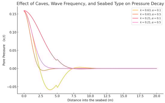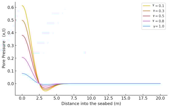 Figure 3 shows the behavior of the solution for different values of It observes that when we have very strong memory effects. The energy from previous waves has a lasting effect, since the pressure decays very slowly. The oscillations have a wave pattern that is almost non-diminishing and continues deep into the seafloor. This is indicative of bottom materials that are extremely viscoelastic, meaning that pressure waves disperse more slowly. The decay accelerates with increasing , reaching , when it approaches traditional exponential behavior.