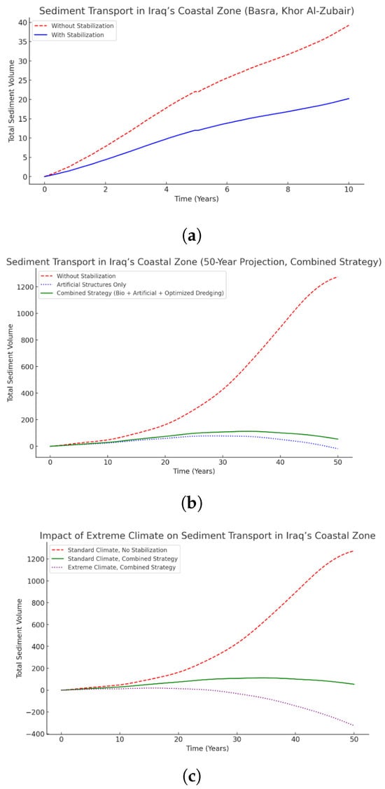 Combined strategy for long-term sediment stability. (a) years. (b) years. After 10 years, 30% more sediment is retained compared to the non-stabilized case. (c) . A mix of bioengineering, artificial reefs, and controlled dredging. After 50 years, 40% more sediment remains compared with the non-stabilized case.