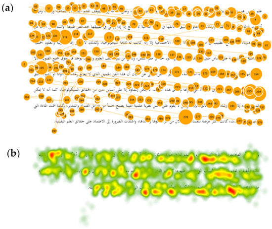Gaze plots show where and for how long a person’s attention is focused, the order of focus, and the reading direction (forward or backward) []. Circles (fixation bubbles) represent eye fixations, with size indicating fixation time, and arrows show saccades, with length indicating the scanning path []. Fixations are numbered [,]. In Arabic, which is read from right to left, less readable text results in shorter saccades, more fixations, and regressions, indicating reading difficulty []. Heatmaps visualize eye fixations by aggregating fixation counts or durations from all participants and highlighting the areas receiving the most attention. A color gradient indicates fixation frequency and duration: red for the most or longest fixations, green for the fewest, and intermediate colors for other levels [].