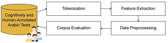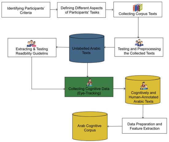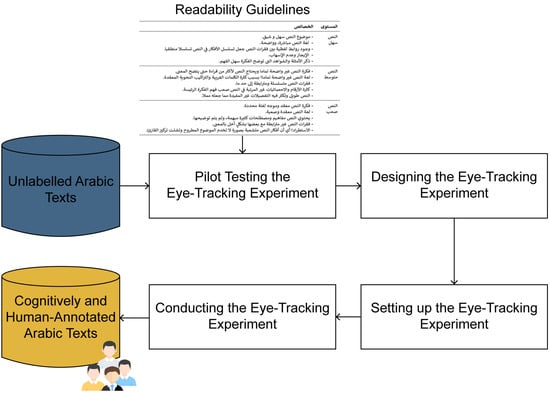 This section outlines the process of collecting eye movement data from Arabic participants, including the design and testing of the eye-tracking experiment, data acquisition, and labeling. Matching the text difficulty to the reader’s level is crucial for learning []. Labeling texts with readability levels is essential for readability assessment models []. NLP has recently focused on annotating data based on user interactions []. By engaging real audiences and using eye-tracking technology, this study identified factors affecting text readability through eye movements. This section details the steps to build the first Arabic cognitive corpus using eye-tracking data, as shown in Figure 4.