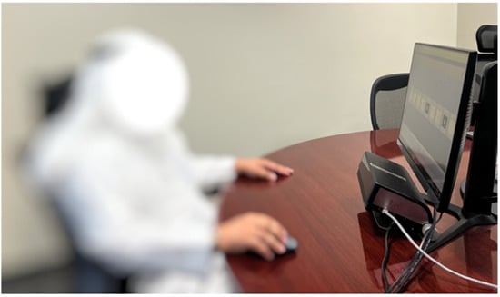All participants satisfied the conditions outlined in Table 2, achieving a minimum APT score of 9, which indicates an advanced–low level with the potential for improvement to superior. This was expected as the participants were highly educated native Arabic speakers, ensuring they could easily interpret the materials []. Most participants had normal vision and did not require corrective lenses, while a few reported slight reductions in visual acuity or mild astigmatism and used eyeglasses or contact lenses accordingly. Additionally, none of the participants reported any reading problems. According to Tobii guidelines, the eye tracker effectively monitors individuals regardless of ethnicity, age, or use of eyeglasses/contact lenses, even under varying light conditions. Participants were advised to avoid wearing reflective eyeglasses and makeup to prevent tracking issues. Individuals with exclusion criteria, such as wet eyes (epiphora), were excluded.