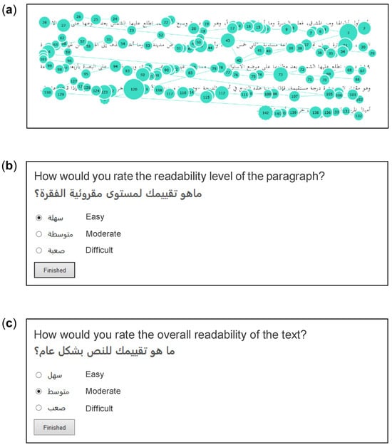 This step involved collecting texts suitable for readability assessment []. Based on a study of 41 Arabic-speaking participants who favored books over newspapers [], the corpus was built from Arabic books to reflect diverse styles and knowledge sources. MSA texts were sourced from Hindawi Foundation books [], and CA texts were sourced from the King Saud University Corpus [], covering authors from the 8th to the 21st centuries. To capture author style without requiring participants to read entire books, short representative excerpts (600–700 words) were selected, such as introductions or standalone sections. Thirteen topics—including grammar, literature, health, and politics—were chosen to ensure variety and engagement []. Texts were selected without predefined readability levels, and the open-source metric for measuring Arabic narratives (OSMAN), the Arabic readability tool (v3.0, 2020), was used to ensure variation [,,]. Despite being published, MSA texts required minimal revision, whereas CA texts required more extensive processing. Using the Qalam tool and support from two linguists, preprocessing steps included the normalization of formatting (e.g., traditional layout and Uthmani script) [], proofreading for spelling and punctuation without changing vocabulary [], and applying appropriate diacritics—partial for MSA and CA texts and full for Quranic verses and sayings of Prophet Muhammad []. Additional adjustments were made to correct paragraph structure, clarify indentations, and standardize punctuation by referencing reliable sources, such as Al Shamela Library (https://shamela.ws) and Wagfeya Library (https://waqfeya.net).