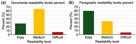 For Arabic, there are limited corpora available for readability assessments that target Arabic L1 and L2 readers, and these corpora are mainly in the educational domain []. Research into readability evaluation in other fields is scarce. A comparison of Arabic L1 and L2 readability studies revealed that many L2 studies drew from similar sources, such as the Global Language Online Support System (GLOSS) platform. In contrast, L1 studies tended to use unique corpora and, consequently, unique annotation scales, which led to different results from those of the L2 studies. This difference could be attributed to the generally larger size of the corpora used in the L2 studies. Nonetheless, it was noted that having a larger corpus size does not necessarily lead to significantly improved accuracy. Therefore, data are probably not the main reason for the observed differences in the outcomes of Arabic readability studies []. In terms of clarity and accessibility, [] noted that L1 corpora are not as transparently detailed or publicly available as L2 corpora, such as Aljazeera. Arabic readability corpora include those used to formulate Arabic readability formulas, such as those in [,]; corpora used to design tools for, and evaluate the readability of, health-related Arabic information [,]; and corpora used in data-driven studies, such as [], which was used in []. Details on specific Arabic corpora used for Arabic readability assessment tasks are provided in Appendix A.
