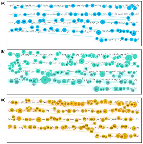 Eye-tracking visualizations offer detailed data from large groups, confirming hypotheses, detecting patterns, and identifying attention-grabbing or ignored elements. They align individual feedback with group metrics, providing deep insights into human behavior [,]. Figure 1 shows visualizations of the results from an eye tracker as participants read two Arabic texts of varying lengths.