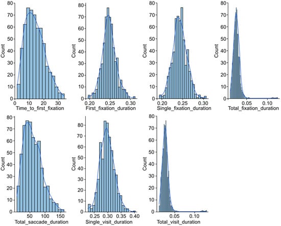 Eye-tracking studies reveal that reading involves sequences of fixations and saccades, with some words fixated on more than once or skipped []. Just and Carpenter [] explored eye movement patterns and cognitive loads in reading scientific papers, assuming the eye lingers on each word for processing time. Frazier and Rayner [] suggested that sentence misinterpretation is corrected through definable strategies, correlating fixation locations and lengths with text processing. Rayner et al. [] found that text difficulty increases fixation number and duration. Liversedge et al. [] added regression path duration and rereading times to key reading time metrics, including first fixation duration, first-pass reading time, and total reading time, in order to better understand eye movements related to textual difficulties. Advanced eye movement recording systems have enabled high-quality recordings, aiding linguistic and psycholinguistic studies [,,,,,,].