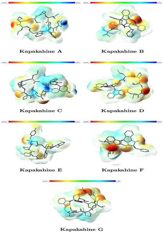 Figure 3 illustrates the molecular electrostatic potential (MEP) maps for Kapakahines A–G. The reddish regions indicate areas of negative electrostatic potential (electron-rich, likely nucleophilic sites), while bluish zones represent positive potential (electron-deficient, likely electrophilic sites). The isovalue was set at 0.020000, enabling consistent comparisons, while the range shown in the color bars is expressed in atomic units (a.u.).