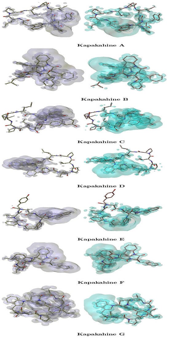 The local hyper-softness (LHS) graphical representations for the Kapakahines A–G are displayed in Figure 4, where the left panels are regions where LHS > 0 indicating electrophilic reactivity, i.e., areas susceptible to nucleophilic attack, and the right panels are zones with LHS < 0 reflecting nucleophilic reactivity, i.e., favorable for electrophilic attack.