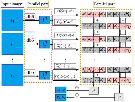 - Step 1. In this step, in order to reduce the volume of calculations, we reduce the size of the image used in the calculations by wavelet transformation. For , derive as the low–low pass filter of the Daubechies wavelet transform at level 5 (db5) for .