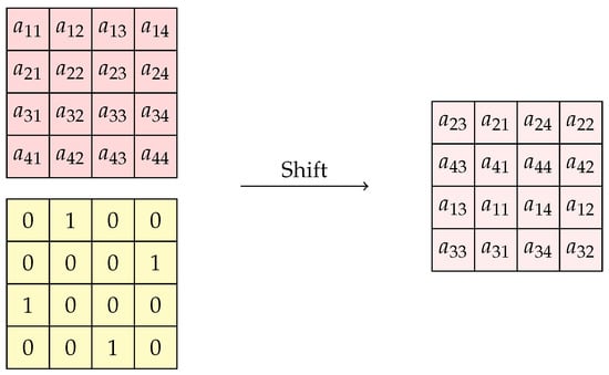 Rearranging pixels of images at the appropriate time is a critical step in image encryption algorithms. In this subsection, we introduce two straightforward and efficient methods, one based on shifting image pixels and the other on swapping image pixels. For the first method, we begin by creating a matrix using a permutation that contains exactly one non-zero element (equal to one) in each row and column (Algorithm 1). Multiplying this matrix with any other matrix leads to shifting the elements of that matrix. In Algorithm 2, the pixels of each layer in the multilayer matrix undergo shifts using distinct permutations. It is noteworthy that in this context, the layer corresponding to each pixel remains unchanged. To illustrate the operation of this function, refer to Figure 3 and Figure 4b.