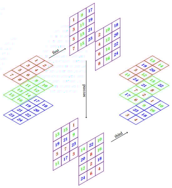 In the second method, pixel locations are altered based on permutations. As the first step, Algorithm 3 is defined. Then compared to the first method, this approach induces more disturbance in the neighborhood of pixels (Algorithm 4). To achieve a more favorable outcome, Algorithm 5 is introduced by incorporating the application of Algorithm 3 to combine the layers of a multilayer matrix. This involves not only changing the rows and columns within each layer but also modifying the arrangement of the layers themselves. To illustrate the operation of this function, refer to Figure 4c and Figure 5. Figure 4d shows the optimal performance of Shift and Rearrange3D when applied consecutively. Note that the second step in Figure 5 is based on the following permutation matrices.