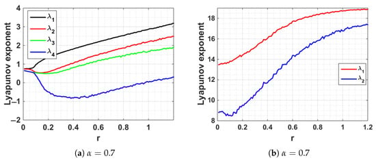 For this value, three possible states occur: greater than zero, equal to zero or less than zero. By utilizing each of these states, the chaotic behavior of the system can be analyzed. If the Lyapunov exponent is greater than zero, then the system is chaotic. If the Lyapunov exponent is less than zero, then the orbit is periodic. When this value is equal to zero, a bifurcation occurs [21]. The graph of this value for two systems is given in Figure 7. According to the results in Figure 7a,b, it can be seen for that some of the Lyapunov exponents of the 4D fractional chaotic system are negative. After using the proposed hybrid chaotic system on the 4D fractional chaotic system with in Figure 7b, it can be seen that all the Lyapunov exponent values are positive. Therefore, the hybrid chaotic system improves the chaotic region of the 4D fractional chaotic system. Also, according to the results, it can be seen that the value of Lyapunov exponent for hybrid system is greater than this value for the 4D fractional chaotic system.