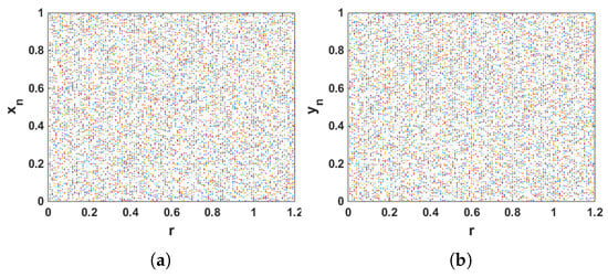 The behavior of this chaotic system is evaluated in Section 4.2. In the following, the output of this system for input values and r is shown by .