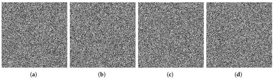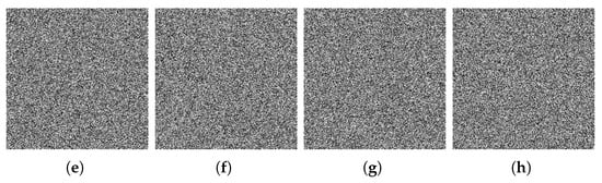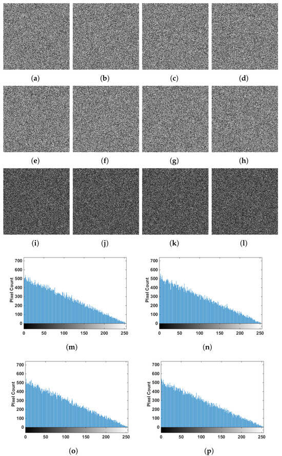 (a–f) Encryption images by , (e–h) encryption images by , (i–l) pixel-by-pixel subtraction of the encryption images and (m–p) histogram of the pixel-by-pixel subtraction of the encryption images.