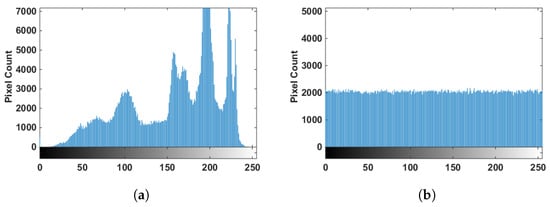 It can be seen that these two key spaces exhibit very little difference. In the first case, the sequence of images is encrypted by the key , and then the sequence of decryption images is checked by the key spaces and . The results of this process are illustrated in Figure 14. It can be seen that the original images cannot be recovered using a key space with only minor differences from the original key. The sequence of images encrypted by these two keys creates different encrypted images even though they are slightly different. In order to show the difference between these two sequences, pixel-by-pixel subtraction and its histogram are shown in Figure 15, and these results show their difference. Consequently, without comprehensive knowledge of the key space, image recovery is not feasible.