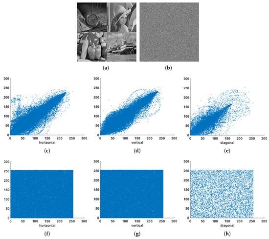 (a) Input images, (b) encrypted images and correlation of neighborhood pixels at different directions (c–e) before encryption and (f–h) after encryption.
